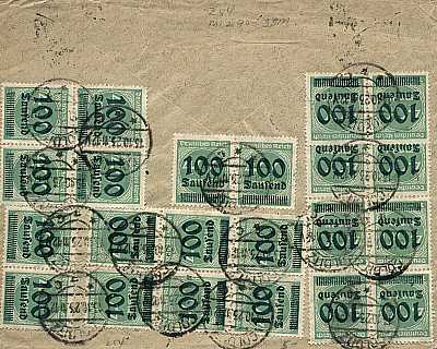 Auslandsdrucksache (51-100 g) vom 06.10.1923 (19. Periode) frankiert mit 12 Marken a 100 000 Mark auf 400 Mark (=1,2 Millionen Mark); nach Österreich galt der Inlandstarif |