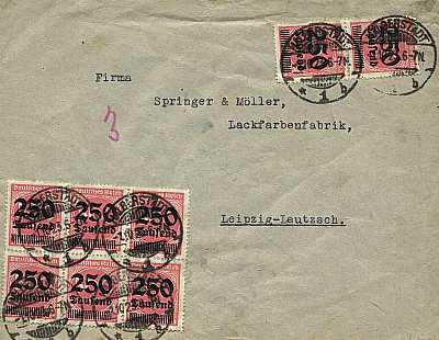 Inland cover (1-20 g) from 01.10.1923 (19. Period) franked with 8 stamps a 250 000 Mark on 500 Mark (=2 Million Mark) |