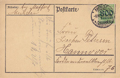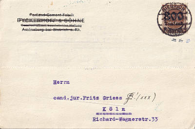Inlandspostkarte vom 08.10.1923 (19. Periode) frankiert mit einer Marke a 800 000 Mark auf 400 Mark (=800 000 Mark)