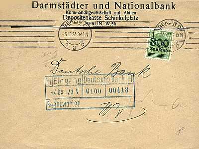 Ortsbrief (1-20 g) vom 03.10.1923 (19. Periode) frankiert mit einer Marke a 800 000 Mark auf 400 Mark (=800 000 Mark)