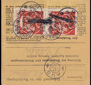 Inland parcel card with value (500 Mark) (6 000 g, < 75 km) from 20.04.1921 (6. Period) franked with 2 stamps a 4 Mark (=8 Mark, 6 parcel 2 value)