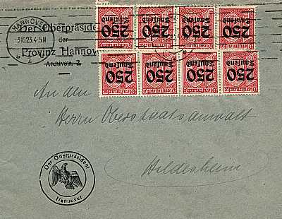 Inland cover (1-20 g) from 03.10.1923 (19. Period) franked with 8 stamps a 250 000 Mark on 10 Pfennig (=2 Million Mark)