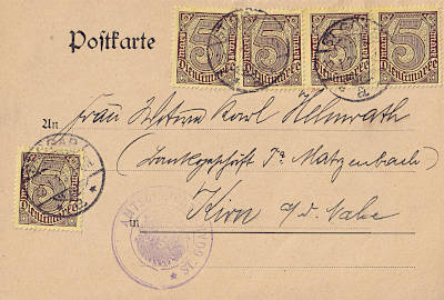 Inlandspostkarte vom 22.01.1923 (12. Periode) frankiert mit 5 Marken a 5 Mark (=25 Mark) |