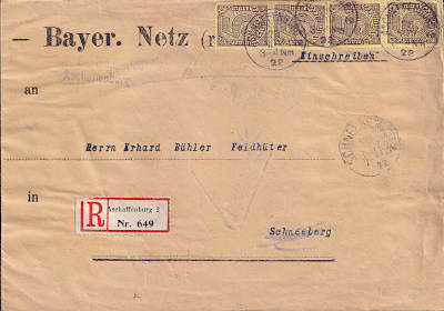 Inlandsbrief mit Einschreiben (1-20 g) vom 10.08.1922 (8. Periode) frankiert mit einer Marke a 5 Mark (=5 Mark, 3 Brief 2 Einschreiben) |
