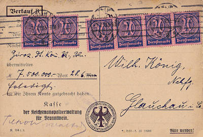 Inlandspostkarte vom 07.07.1923 (14. Periode) frankiert mit 6 Marken a 20 Mark (=120 Mark) |