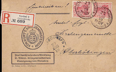 Ortsbrief mit Einschreiben und Nachnahme (1-20 g) vom 04.12.1918 (3. Periode) frankiert mit 4 Marken a 10 Pfennig (=40 Pfennig, 10 Brief 20 Einschreiben 10 Nachnahme) |