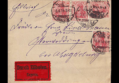 Inlandsbrief mit Eilzustellung (1-20 g) vom 05.06.1919 (3. Periode) frankiert mit 4 Marken a 10 Pfennig (=40 Pfennig, 15 Brief 25 Eilzustellung) |