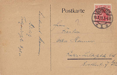 Inlandspostkarte vom 19.03.1919 (3. Periode) frankiert mit einer Marke a 10 Pfennig (=10 Pfennig) |