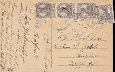 Foreign postcard from 13.09.1917 (2. Period) franked with 4 stamps a 2½ Pfennig (=10 Pfennig) |