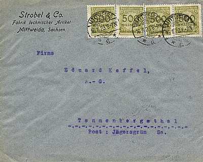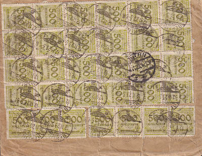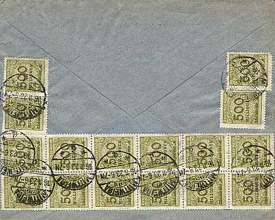Foreign cover (1-20 g) from 13.11.1923 (24. Period) franked with 80 stamps a 500 Million Mark (=40 Billion Mark) |