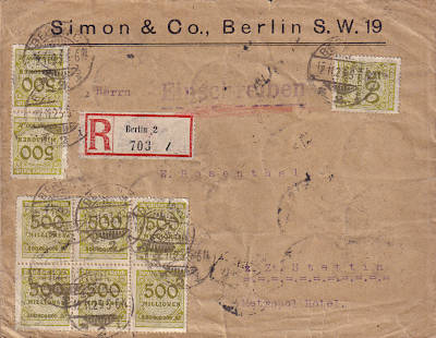 Inland cover with registeration (1-20 g) from 12.11.1923 (24. Period) franked with 40 stamps a 500 Million Mark (=20 Billion Mark, 10 Billion cover 10 Billion registeration) |