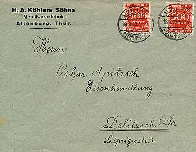 Inlandsbrief (1-20 g) vom 18.08.1923 (15. Periode) frankiert mit 2 Marken a 500 Mark (=1 000 Mark)