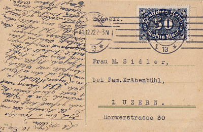 Foreign postcard from 31.12.1922 (11. Period) franked with one stamp a 50 Mark (=50 Mark) |