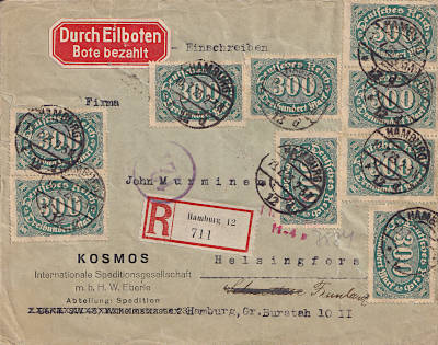 Foreign cover with registeration and special delivery (1-20 g) from 10.07.1923 (14. Period) franked with 9 stamps a 300 Mark (=2 700 Mark, 800 cover 300 registeration 1 600 special delivery) |