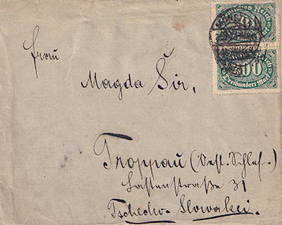 Foreign cover (1-20 g) from 26.07.1923 (14. Period) franked with 2 stamps a 300 Mark (=600 Mark); to Czechoslovakia a reduced foreign fee was valid |
