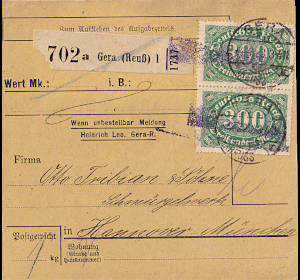 Inland parcel card (5 000 g, > 75 km) from 13.03.1923 (12. Period) franked with 2 stamps a 300 Mark (=600 Mark) |
