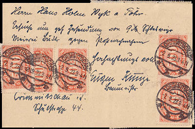Foreign cover (1-20 g) from 17.08.1923 (15. Period) franked with 6 stamps a 500 Mark (=3 000 Mark) |