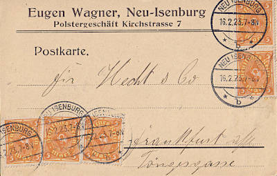 Inlandspostkarte vom 16.02.1923 (12. Periode) frankiert mit 5 Marken a 5 Mark