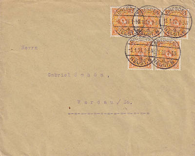 Inlandsbrief (1-20 g) vom 05.01.1923 (11. Periode) frankiert mit 5 Marken a 5 Mark
