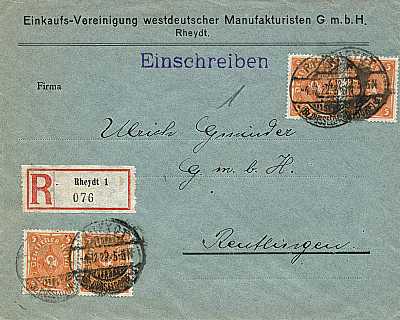 Inlandsbrief mit Einschreiben (1-20 g) vom 04.12.1922 (10. Periode) frankiert mit 4 Marken a 5 Mark (=20 Mark, 12 Brief 8 Einschreiben)