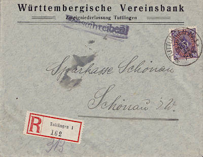 Inlandsbrief mit Einschreiben (1-20 g) vom 28.11.1922 (10. Periode) frankiert mit einer Marke a 20 Mark (=20 Mark, 12 Brief 8 Einschreiben) |