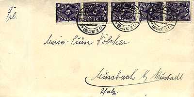Inland cover (1-20 g) from 16.04.1923 (13. Period) franked with 5 stamps a 20 Mark (=100 Mark) |