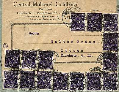 Inland cover (1-20 g) from 05.07.1923 (14. Period) franked with 15 stamps a 20 Mark (=300 Mark) |