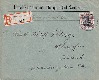 Auslandsbrief mit Einschreiben (1-20 g) vom 04.07.1912 frankiert mit einer Marke a 40 Pfennig (=40 Pfennig, 20 Brief 20 Einschreiben) |