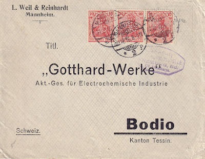Auslandsbrief (21-40 g) vom 27.12.1916 frankiert mit 3 Marken a 10 Pfennig(=30 Pfennig)
