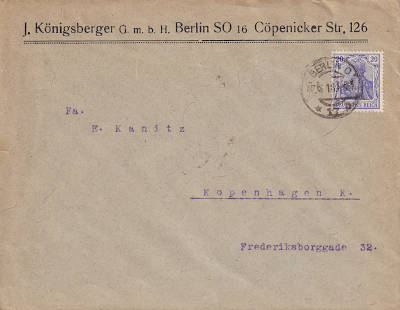 Auslandsbrief (1-20 g) vom 17.06.1918 frankiert mit einer Marke a 20 Pfennig(=20 Pfennig)