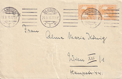 Foreign cover (1-20 g) from 29.09.1916 franked with 2 stamps a 7½ Pfennig(=15 Pfennig)