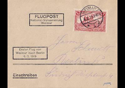 Inlandsbrief mit Eilzustellung und Luftpost (1-20 g) vom 06.02.1919 frankiert mit einer Marke a 1 Mark (=1 Mark) |