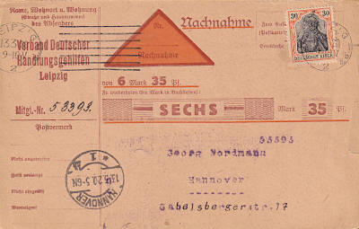 Inlandsbrief mit Nachnahme (1-20 g) vom 24.04.1920 frankiert mit 3 Marken a 15 Pfennig (=45 Pfennig, 20 Brief 25 Nachnahme) |