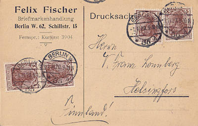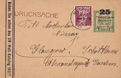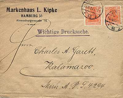Auslandsdrucksache (1-50 g) vom 14.10.1920 frankiert mit 2 Marken a 10 Pfennig(=20 Pfennig)