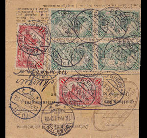 Foreign parcel card with value (200 Mark) (11 500 g, > 75 km) from 08.10.1920 franked with 8 stamps (=9,50 Mark, 8 parcel 0,50 registeration 1 value) |
