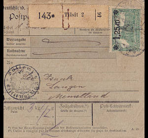 Foreign parcel card (3 500 g, < 75 km) from 31.12.1920 franked with one stamp a 1,25 Mark on 1 Mark (=1,25 Mark) |