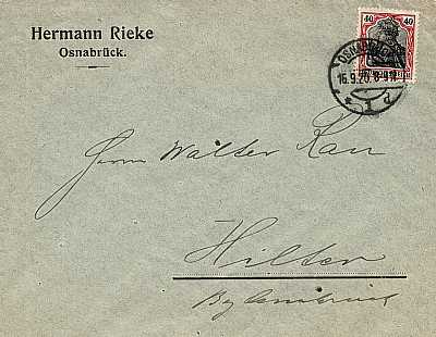 Inland cover (1-20 g) from 16.09.1920 franked with one stamp a 40 Pfennig (=40 Pfennig) |