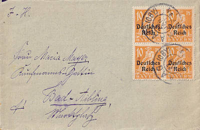 Inland cover (1-20 g) from 21.10.1920 franked with 4 stamps a 10 Pfennig (=40 Pfennig) |