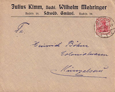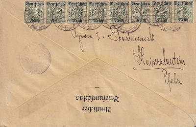 Inland cover (1-20 g) from 27.08.1920 franked with 8 stamps a 5 Pfennig (=40 Pfennig) |