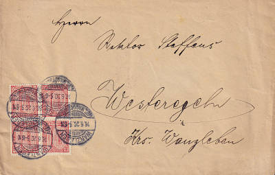Inland cover (1-20 g) from 16.06.1920 franked with 4 stamps a 10 Pfennig (=40 Pfennig) |