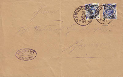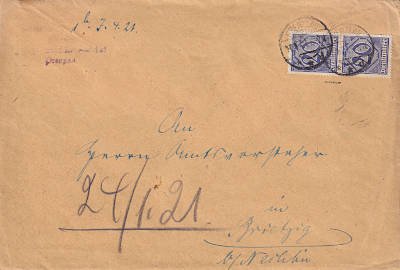 Inland cover (1-20 g) from 27.02.1921 franked with 2 stamps a 20 Pfennig (=40 Pfennig) |