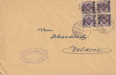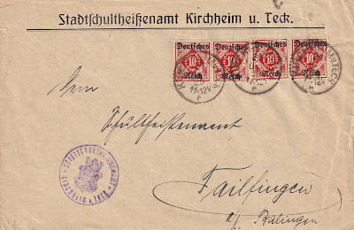 Inland cover (1-20 g) from 24.08.1920 franked with 4 stamps a 10 Pfennig (=40 Pfennig) |