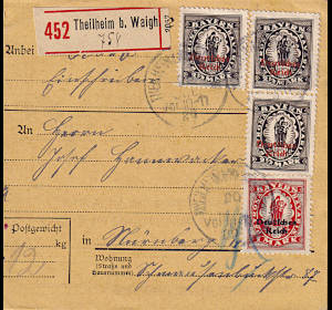 Inlandspaketkarte mit Einschreiben (12 000 g, > 75 km) vom 20.07.1920 frankiert mit 4 Marken (=8,50 Mark, 8 Paket 0,50 Einschreiben) |