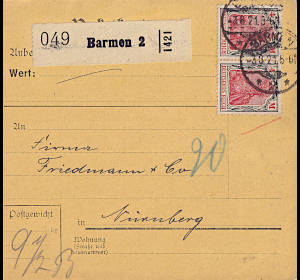 Inlandspaketkarte (4 000 g, > 75 km) vom 14.05.1921 frankiert mit 2 Marken a 2 Mark (=4 Mark) |