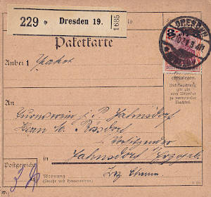 Inlandspaketkarte (4 500 g, < 75 km) vom 14.07.1921 frankiert mit einer Marke a 3 Mark (=3 Mark) |