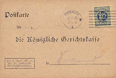 Inlandspostkarte vom 16.01.1922 frankiert mit einer Marke a 1,25 Mark (=1,25 Mark) |