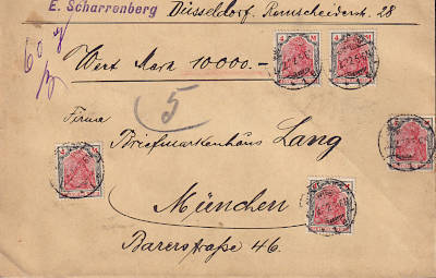 Inlandsbrief mit Wertangabe (2 000 Mark) (154 g) vom 04.05.1922 frankiert mit 3 Marken a 3 Mark (=9 Mark, 4 Brief 2 Einschreiben 3 Wert) |