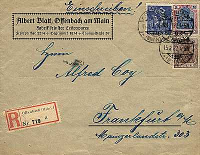 Ortsbrief mit Einschreiben (1-20 g) vom 15.02.1922 frankiert mit 3 Marken (=3,25 Mark, 1,25 Brief 2 Einschreiben) |