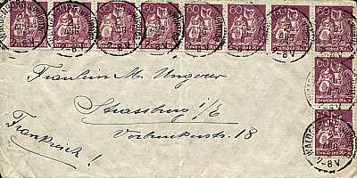 Auslandsbrief (1-20 g) vom 02.08.1922 frankiert mit 10 Marken a 60 Pfennig(=6 Mark)