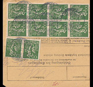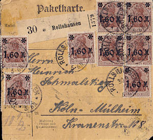 Inlandspaketkarte (4 500 g, > 75 km) vom 04.09.1922 frankiert mit 14 Marken a 1 Mark (=14 Mark) |